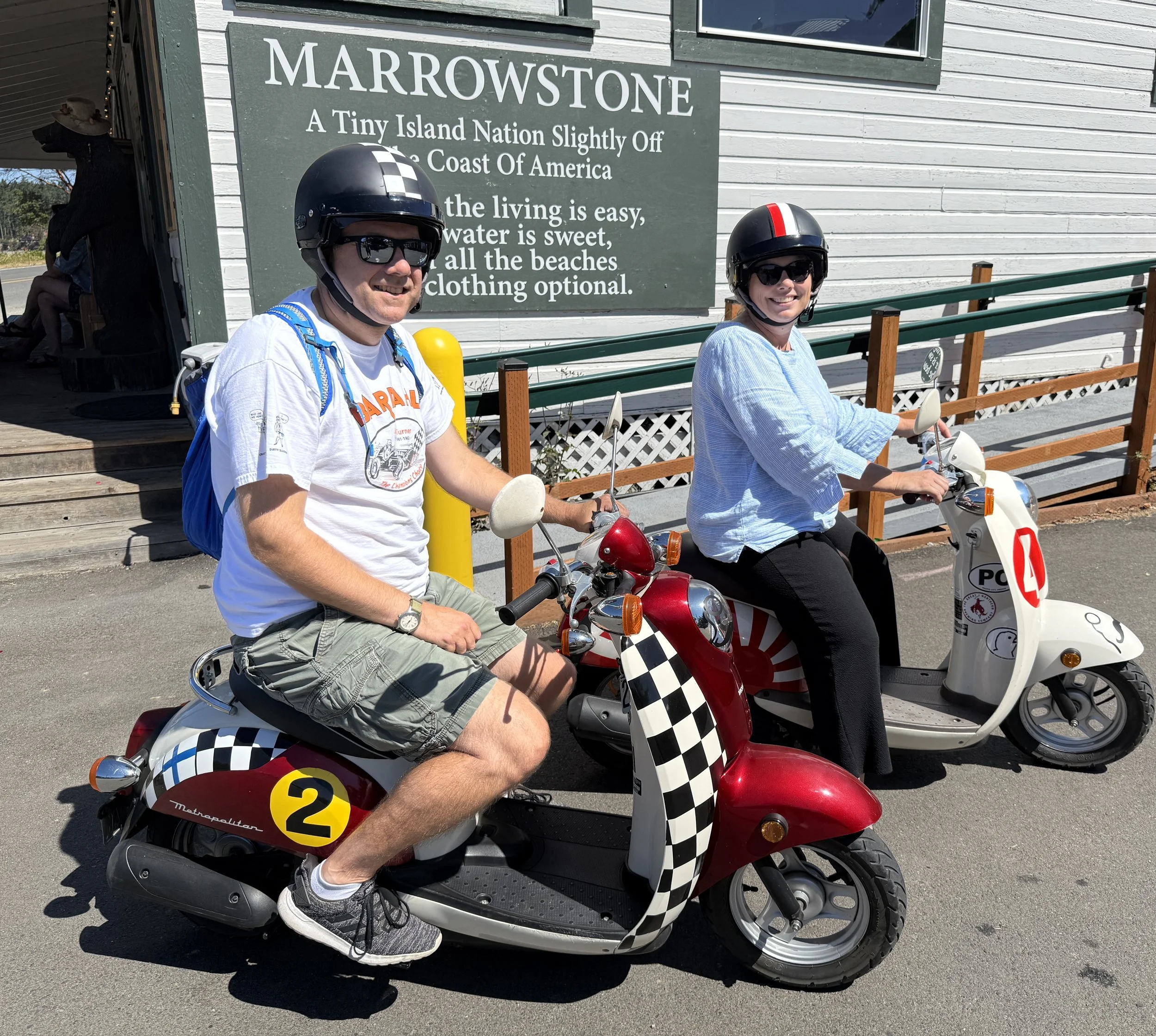 Chris and Heather zip around Marrowstone on Honda scooters, taking breaks from city life in Seattle.