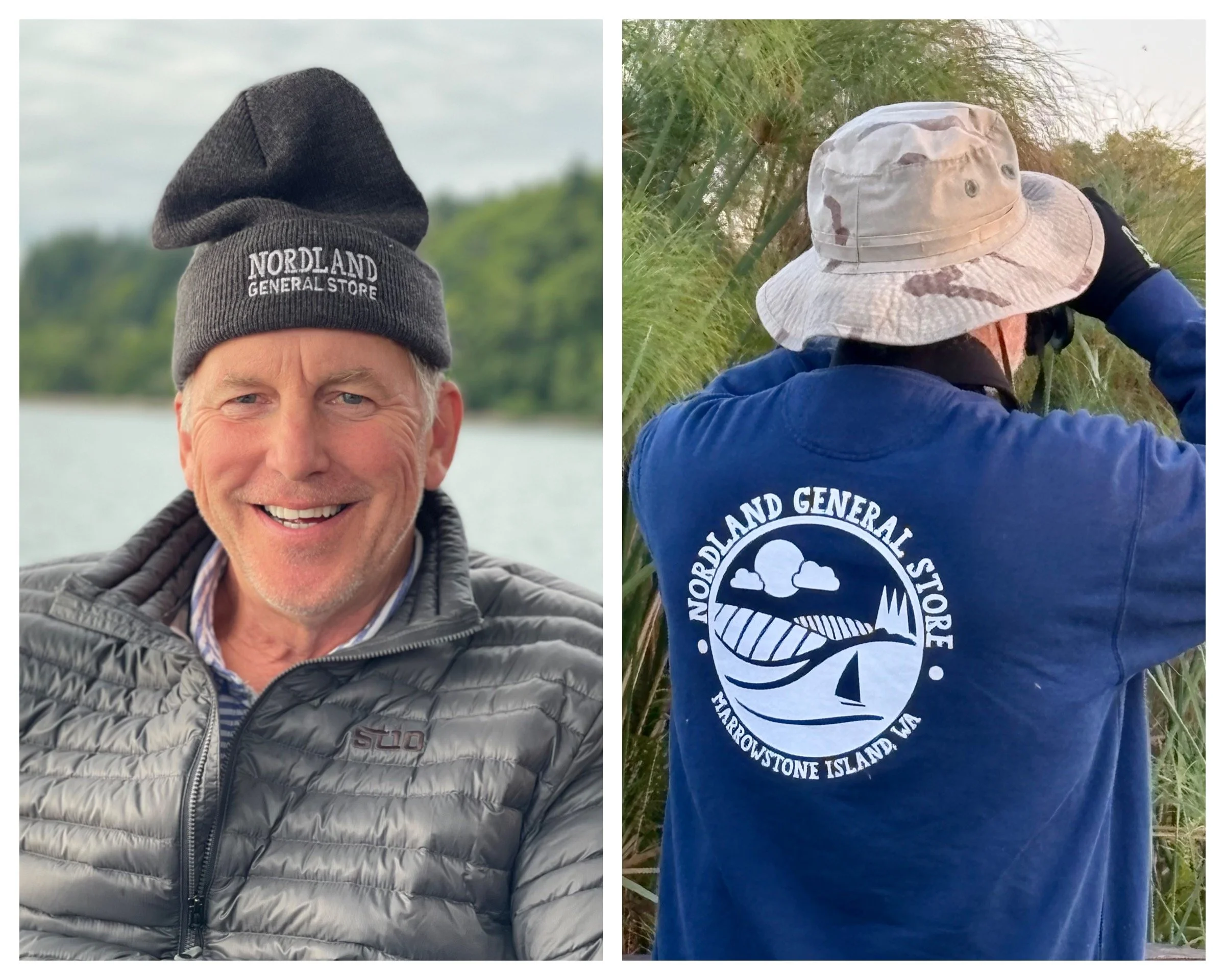 Peter modeled his NGS beanie while boating in Dabob Bay and George of the Jungle sported his NGS crewneck sweatshirt while hunting for black mamba snakes in Botswana.